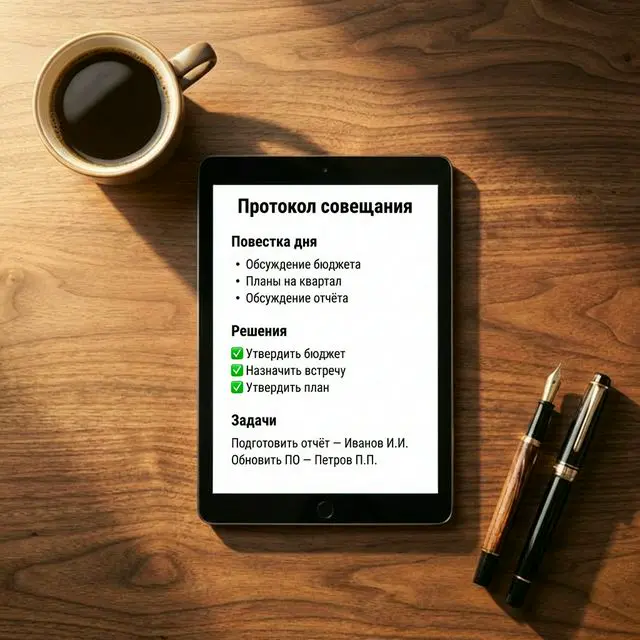 Вместо ручной подготовки протокола встречи — 2 минуты на проверку готового документа. Ваше время — для стратегии и управления, а не для стенографии.
